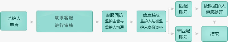 4、身份確認(rèn)完畢后,監(jiān)護(hù)人主管會(huì)在72小時(shí)內(nèi)通知監(jiān)護(hù)人與被監(jiān)護(hù)人監(jiān)護(hù)申請的結(jié)果,并安排三方通話最終確認(rèn)身份,若監(jiān)護(hù)人申請成功,監(jiān)護(hù)主管會(huì)按照監(jiān)護(hù)人的申請,對被監(jiān)護(hù)人賬號進(jìn)行處理。